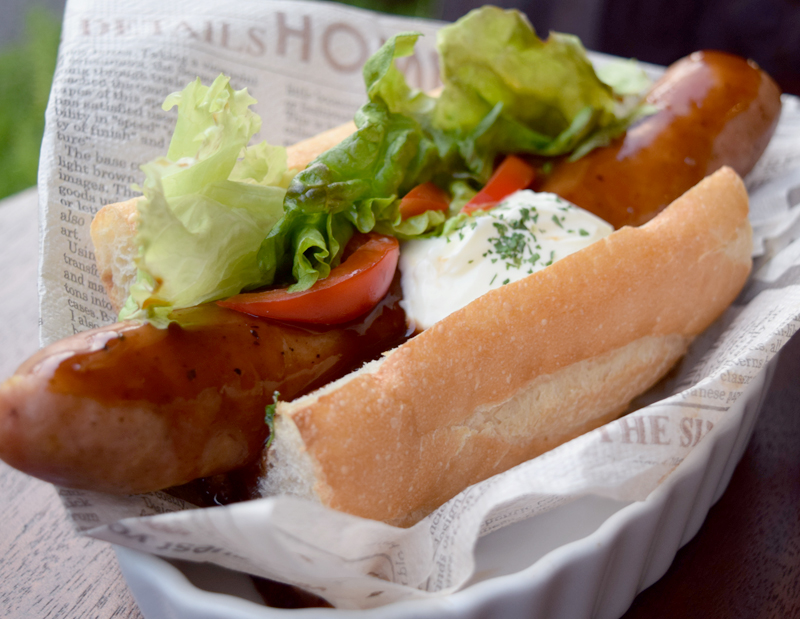 ハーブの香りが効いた肉厚なソーセージをまるごと1本バゲットに挟みました。